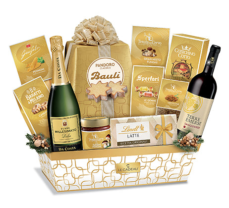Vassoio serigrafato, Pandoro incarto a mano Bauli g 700, Spumante millesimato dolce Da Costa cl 75, Tavoletta cioccolato al latte Lindt g 100, Canestrelli Baratti & Milano g 80, Morbide gelées alla frutta Sperlari g 100, Pasta Pennoni rigati Garofalo g 250, Misto funghi secchi Tenuta del Cervo g 15, Sugo ai funghi Porcini Tenuta del Cervo g 190, Lenticchie Tenuta del Cervo g 175, Cotechino cotto Piatti d’Autore g 250, Vino Sangiovese Terre Emerse cl 75