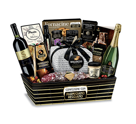 Elegante vassoio regalo litografato, Originale Ricettario Parmigiano Reggiano, Panettone classico incartato a mano Balocco g 500, Spumante brut Il Mossiere cl 75, Fusilli Pasta del Mulino g 250, Riso Thai italiano g 250, Fornacine al Parmigiano Reggiano g 100, Salsa al Parmigiano Reggiano g 185, Patè di olive nere Crespi g 130, Lenticchie della Tradizione Gourmet in Tavola g 150, Cotechino cotto Bellucci g 250, Salame nostrano g 100, Trancio di Parmigiano Reggiano g 125, Aceto di vino rosso Vigna Oro cl 25, Sangiovese Puglia IGT Terre del Sale cl 75