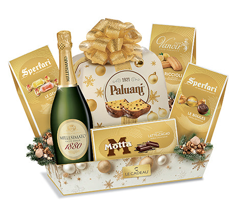 Vassoio decorato, Panettone astucciato Paluani g 500, Spumante millesimato dolce 1880 cl 75, Tavoletta cioccolato ripiena cacao Motta g 100, Boulesl latte ripieno nocciola Sperlari g 85, Riccioli al limone di Sorrento IGP Vanoir g 80, Morbide gelées alla frutta Sperlari g 100