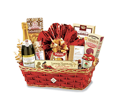 Cesto rettangolare in vimini rosso e oro, Panettone classico in cellophane Paluani g 500, Spumante dolce millesimato Chiostro Palatino Vesprino cl 75, Torrone friabile mandorlato Cestaro g 75, Praline Le Gemme Vergani g 100, Pasticceria di Sassello La Sassellese g 100, Pasta di semola Casarecce S. Antonio g 250, Sugo pomodoro e basilico Frutti del Casale g 185, Lenticchie della Fortuna Melandri g 200, Cotechino precotto Trionfo del Cotechino Salumificio Vecchi g 250