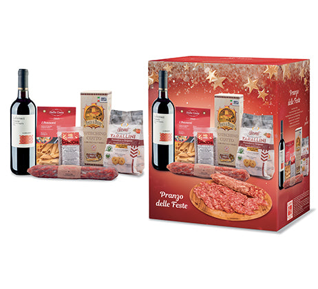 Elegante strenna natalizia, Pennoni trafilati al bronzo Dalla Costa g 250, Tarallini pomodoro e origano Terre di Puglia g 100, Lenticchie Chicchi della Fortuna Melandri g 250, Cotechino cotto Salumificio Vecchi g 250, Salame Casereccio Salumi Caputo g 200 ca, Vino rosso Cabernet Veneto IGT Le Morre cl 75
