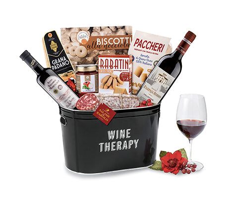 Secchiello portaghiaccio in latta verniciata, Biscotti alla nocciola Piemonte IGP Crispiani g 90, Paccheri pasta 100% italiana trafilata ruvida Cruset g 250, Rabatin al pecorino e pepe Monviso Group g 50, Sugo alla Contadina Saporie g 185, Trancio Grana Padano DOP Virgilio g 150, Salame al Barolo Salumificio Gonella g 100 ca., Parpaja rosso Collezione Manòt cl 75, Aceto balsamico di Modena IGP Varvello cl 25